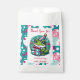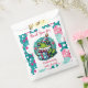 Gracias personalizado por celebrar con nosotros bolsos de cumpleaños. Llénales de regalos para agradecerles a los invitados por venir. Una adorable rana en un gorra de cumpleaños sosteniendo un regalo con un lindo fondo de punto de polka en rosa y verde azulado. Añadir nombre en el área personalizada.