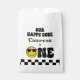 Amarillo blanco negro Nuestro Feliz Amigo Primer Cumpleaños Favor Bagn Tipo simple y dulce feliz primer cumpleaños bolso de favores para un bebé con cara amarilla y gafas negras, texto de estilo retro y patrón de tablero de ajedrez negro y blanco.