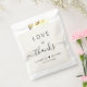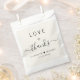 Bolsas de favoritas de crema clara de moda para sus invitados bodas que presentan "Amor + Gracias" en una tipografía moderna y simple y un guión elegante con toques, sus nombres unidos por un corazón y su cita boda.