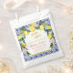 Este encantador, hermoso y fresco diseño de bolsas de favores para despedida de soltera con baldosas azules y limones cítricos mediterráneos italianos presenta vibrantes limones en acuarela y delicadas rosas rosadas, complementadas con un intrincado patrón de baldosas azules mediterráneas italianas con la inscripción "Grazie Mille" en caligrafía de letras doradas y letras rosadas. Estas bolsas de favores prometen traer el encanto del Mediterráneo a tu fiesta de despedida de soltera. Fácilmente personalizables y editables. Puedes transferir este diseño a una variedad de productos sin esfuerzo.