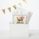 Trate a sus huéspedes con nuestras adorables bolsitas de papel para bebé con una hermosa vaca marrón color agua sobre un fondo blanco limpio y un borde de manto de gingham beige. Es muy fácil de personalizar con tus detalles, para una manera especial y única de tratar a tus invitados en tu ducha de bebé.