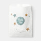 Complementa los favores de primer cumpleaños de tu hijo con estos lindos bolsos de agradecimiento. Los colores azul y naranja del globo y las estrellas son relajantes y hermosos. Personalice el texto con su propio texto. Ilustrado y diseñado por Patricia Álvarez.