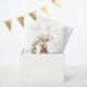 Este diseño presenta un oso de peluche Navidad con sombrero de Santa y regalos en el interior de Navidades coronados por poinsettia, follaje verde y bayas rojas. Puede ajustar el texto de acuerdo con sus requisitos.