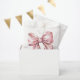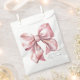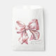 Un encantador diseño de bolsa de regalo para fiesta con un gran lazo rosa en acuarela centrado en la parte delantera. El nombre de la futura mamá se muestra en una fuente serif clásica en la parte inferior, con "Baby Shower" escrito elegantemente debajo en caligrafía manuscrita.