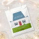 Bienvenido a su nuevo cliente a su casa con regalos llenando esta bolsa de favores de cliente que parece una casa, con techo azul, puerta roja, paneles de madera blanca y el año por encima de la puerta. En la parte posterior de la caja aparece su sentimiento, nombre y logotipo de la empresa. Ideal para el agente inmobiliario u otra persona que desee tratar a su cliente o cliente con una alternativa a una canasta de regalo. Los elementos de la caja que incluyen su logotipo, como cookies y otros artículos, también se encuentran en mi tienda, One Stop Business Shop (www.Zazzle.com/OneStopBusinessShop).