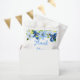 This beautiful and elegant wedding favor bag features watercolor baby blue and navy blue flowers with foliage. The text combines handwritten script and serif fonts for a stylish and modern look. This is perfect for a spring or summer rustic wedding.