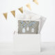 Bolsas de regalo para bebés con chorro de agua y tarro de albañilería azul bonito y rama de flores de cerezo azul sobre un fondo rústico de bupón. Personalice estos rústicos frascos de malla de bupón con el texto de su elección.