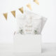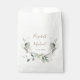 Bolsas de regalo elegantes para sus invitados de boda con acuarelas de vegetación de eucalipto verde salvia, hojas de laurel con acentos dorados, sus nombres en una elegante letra dorada y la fecha de su boda en tipografía gris suave moderna.