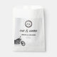 ¡Conduciendo a Forever! Moderno, sencillo, informal, moto, ciclismo, aventura, monogramado, bolsa de favoritas de boda con una rueda de moto que puedes personalizar con tus iniciales, fondo gris moderno y dibujo de moto al borde.