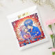 Boda personalizado trata con un tema anime. Niño animado y chica acurrucado rodeado de coloridos corazones y flores. Chica de anime y niño con pelo azul. Los colores son el rojo, el azul, el blanco y el rojo.