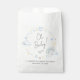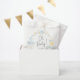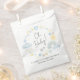 Chico y caprichoso bolso de baño para bebés con acuarelas azul y amarillo pastel de un arcoiris, sol, corazones, estrellas, lunas y nubes y "¡Oh bebé!" en un elegante guión de caligrafía. Personalice el nombre de la futura madre y la fecha de la ducha en una simple tipografía moderna.