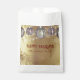 Esta bolsa de favor personalizable presenta un fondo dorado brillante y opulento salpicado de brillo falso, que recuerda al brillo del champán. En la parte superior, cinco elegantes borlas rayadas en plata y borgoña cuelgan con gracia. El mensaje "FELIZ NAVIDAD" se muestra de manera prominente en una escritura festiva de color rojo cranberry, con espacio debajo para personalizar. Este diseño lujoso captura el brillo elegante de una gala de invierno, lo que lo hace perfecto para los favores de la fiesta de Navidad o regalos de Navidad.