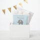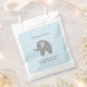 Cute elefante gris, papel de ducha de bebé, favorece las bolsas. Suministros de fiesta personalizados para chicas o niños con ducha de bebé. Agrega tu propio nombre y gracias por el mensaje que viene. Elegante plantilla de tipografía de escritura gris. Fondo de impresión de zigzag azul o chevron de color personalizado. Diseño de patrones de zag Zig. Saca dulces y pasteles para los huéspedes.