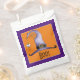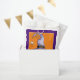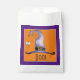 Fun Halloween bolso de favores incluye ilustracion acuarela de un gorra bruja morado con araña colgante y personalizable blanco "Boo!" texto sobre fondo naranja y púrpura