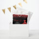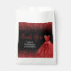 A beautiful bright red themed elegant watercolor dress gown on a black background with faux glitter at the top and bottom of the favor bag.
