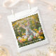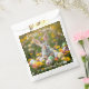 Bolso personalizado de favores para tu fiesta de Pascua o celebración. Hermoso conejito sentado en un césped lleno de flores y huevos de Pascua.