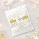 Este diseño presenta un caballito de mar con un patrón de onda oceánica con efecto dorado. La imagen costera al estilo Art Deco hace bolsas de favor modernas y únicas con texto personalizado para cumpleaños, bodas y más.