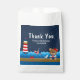Esta bonita y divertida bolsa de favores incluye un oso marinero chica sobre una cubierta de madera con gaviota y cangrejo. Al fondo, un faro rojo y blanco, un bonito pájaro en un velero, olas del océano y un cielo estrellado azul marino. El texto combina fuentes audaces y serif para un estilo elegante y moderno. Es ideal para una fiesta de cumpleaños con temática náutica.