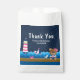 Esta bonita y divertida bolsa de favores incluye un oso marinero chica sobre una cubierta de madera con gaviota y cangrejo. Al fondo, un faro rosa y blanco, un bonito pájaro en un velero, olas del océano y un cielo estrellado azul marino. El texto combina fuentes audaces y serif para un estilo elegante y moderno. Es ideal para una fiesta de cumpleaños con temática náutica.