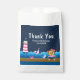 Esta bonita y divertida bolsa de favores incluye un mono marinero chica en una cubierta de madera con gaviota y cangrejo. Al fondo, un faro rosa y blanco, un bonito pájaro en un velero, olas del océano y un cielo estrellado azul marino. El texto combina fuentes audaces y serif para un estilo elegante y moderno. Es ideal para una fiesta de cumpleaños con temática náutica.