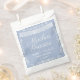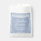 Elegant dusty blue baby shower favor bag featuring delicate white papel picado artwork and the phrase “Muchas Gracias” in flowing script. Personalized with the parents’ names and event date, this soft Mexican-inspired design adds a beautiful cultural touch to your Cielito Lindo baby shower celebration.