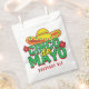Estos bolsos de cinco de mayo con un sombrero amarillo grande con las palabras "cinco de mayo" en un color verde decorativo.