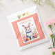 Un pequeño conejo dulce rodeado de polka rosa y coral y blanca con flores color agua ilustracion de la ducha bebé bolsa de favores.