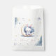 Bolsa de favor super linda con conejito blanco pequeño lindo que lleva un hermoso lazo azul sentado en una luna encantadora con algunas estrellas doradas que caen y algunas nubes azules polvorientas.