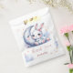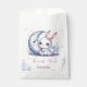 Bolsa de favor super linda con conejito blanco lindo que lleva un lazo rosa hermoso sentado junto a una luna creciente plateada con algunas estrellas doradas cayendo.