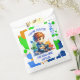 Gracias personalizado a los bolsos de favor. Niño lindo jugando videojuegos. Color azul, verde y naranja de fondo salpicado de pintura.