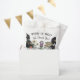 Cajas de regalo blancas para los favores de la ducha de bebé de Halloween. El diseño del cottagecore presenta ilustraciones florales de otoño morados de plantas venenosas como belladonna, hemlock y amapolas negras. Los fantasmas de hongos cutáneos vuelan alrededor de las flores. El texto se puede personalizar fácilmente con los detalles de la ducha de bebé.