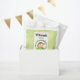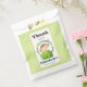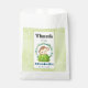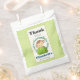 Gracias por hacer bolsos de cumpleaños con un ilustracion personalizado de un mono que se asoma por detrás de un arbusto verde. Rodeado por una corona de hojas tropicales. Situado sobre un fondo de color verde oliva.