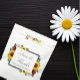 El diseño presenta girasoles, rosas y margaritas elegantes con una paleta de colores otoñales dorado amarillo, rojo y blanco. El diseño también presenta un marco gris carbón. Puede cambiar el color de fondo en la parte delantera y trasera al color de su elección o dejar ambos en blanco.