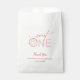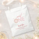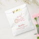 Este bolso de favoritas de la fiesta de 1 cumpleaños del chica incluye un texto elegante que dice "dulce UNO" acentuado con un donut rosado y rociadas. El texto personalizado le permite personalizar con un mensaje de agradecimiento y el nombre del niño.