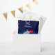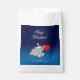 elefante lindo con gorra rojo y bolsa con regalos de Navidades sobre fondo azul con copos de nieve blancos