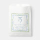Bolsas de favores de fiesta elegantes para su despedida de soltera con marcos de acuarela florales azules y verdes vintage con volantes inspirados en la era grandmillenial, un delicado lazo coquette azul en acuarela, "un dulce agradecimiento" presentado en una elegante letra de caligrafía azul, y el nombre de la novia y la fecha de la fiesta en tipografía serif clásica.