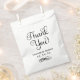 Las bolsas favoritas de bodas presentan un diseño de escritura decorativa de escritura de color negro "Gracias" con diseño de monograma personalizado que incluye los nombres de novias y novios y la fecha boda.