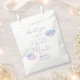 Sueño bolsa de favores para ducha de novia con un ilustracion acuarela de nubes rosas, púrpura y azules con un texto de tipografía que dice "la novia está en la nube nueve".