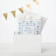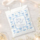 Bolsas de favores personalizadas para la despedida de soltera de Ella está atando el nudo en azul y blanco. Estilo de caligrafía a mano elegante con un patrón de lazo lindo. Simplemente personalice la plantilla con el título y la fecha de su evento. © Kimbellished, LLC