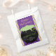 Esta colorida bolsa de favores de Halloween presenta una olla de bruja negra de sopa de burbujas verdes. Las franjas verde claro, naranja y violeta acentúan el fondo. El texto naranja de arriba dice: Feliz Halloween. El texto verde lima de personalizable en la olla dice: Un personalizable especial y texto blanco, cerca de la parte inferior, te permite añadir tu nombre.
