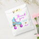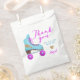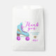 Bolsa de cumpleaños Groovy y divertida de patinaje temático con ilustracion de patinaje rosa y azul. El texto dice "gracias por rodar con nosotros".