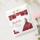 This sweet sixteen favor bag features a beautiful princess in a burgundy red ball gown with floral arrangements. This is perfect for a sweet sixteen birthday party.
