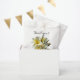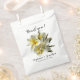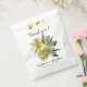 Bolsos florales de favoritas de boda para decir "gracias" a los invitados. Flores de plumeria amarilla y blanca con texto encima y debajo del ramo realista de flores. Incluya los nombres de la novia y del novio con la fecha del boda. Las bolsas blancas vienen en conjuntos de 50 en dos tipos de papel.