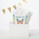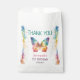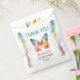 Personalized butterfly birthday favor bag featuring a vibrant watercolor rainbow butterfly with soft pastel splashes and delicate star accents. Customized with your child’s name and birthday details, this sweet design is perfect for sending guests home with treats after a first birthday celebration.