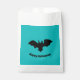 Flying bat on teal favor bag. Happy Halloween!