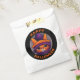 Gato naranja con Gorra de bruja morada Feliz Pegatina de Halloween. Un dibujo de un lindo gato naranja con un gorra morado y naranja. Feliz texto de naranja de Halloween con fondo negro.