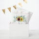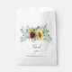 En encantador estilo bohemio, este diseño de bolsa de favores alegre presenta un ramo despreocupado de girasoles amarillos y rosas borgoña con follaje de eucalipto colgante. El estilo transmite un encanto rústico casual y la felicidad y la alegría que se siente cuando se reúne para celebrar una ocasión especial. Ya sea que su evento se celebre al aire libre o en un interior, este diseño funciona maravillosamente para una variedad de entornos. Hace una buena bolsa de favores para rellenar con productos horneados o pequeños regalos y favores de fiesta para su evento.