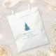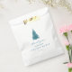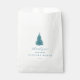 Esta simple bolsa de favores de quinceanera de invierno "muchas gracias a la nieve" presenta un hermoso árbol de Navidad azul verde azulado con copo de nieve y su nombre personalizado y elegante guión de agradecimiento azul.