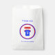 Una divertida y colorida bolsa de favores de la fiesta de cumpleaños número 9 lista para tu texto personalizado, que actualmente dice (en azul) "GRACIAS" "por venir a mi fiesta". El diseño presenta un gran cartel rojo de cumpleaños con el mensaje "FELIZ CUMPLEAÑOS". Debajo hay una camiseta deportiva azul y roja, con un gran número blanco de 9 y espacio para el nombre del niño de cumpleaños. Este tiene un fondo de estrellas azules dispersas y está rodeado de rojo y azul.