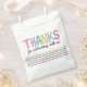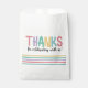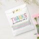 Cute ducha bebé, mochilas de favores con un extravagante texto escrito a mano en color arcoiris que explica "¡GRACIAS por celebrar con nosotros!" Un grupo de rayas arcoiris a juego debajo del texto agregan un acento colorido a este diseño despreocupado.